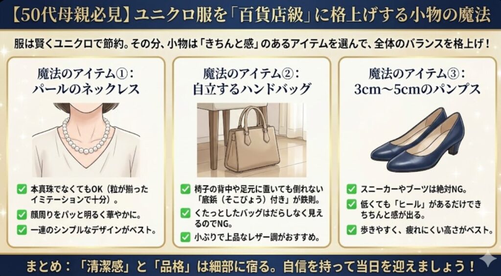 服をユニクロで安く抑えた分、小物には少し気を配りましょう。 ここで全体のバランスを取るのが「賢い主婦」のテクニックです。