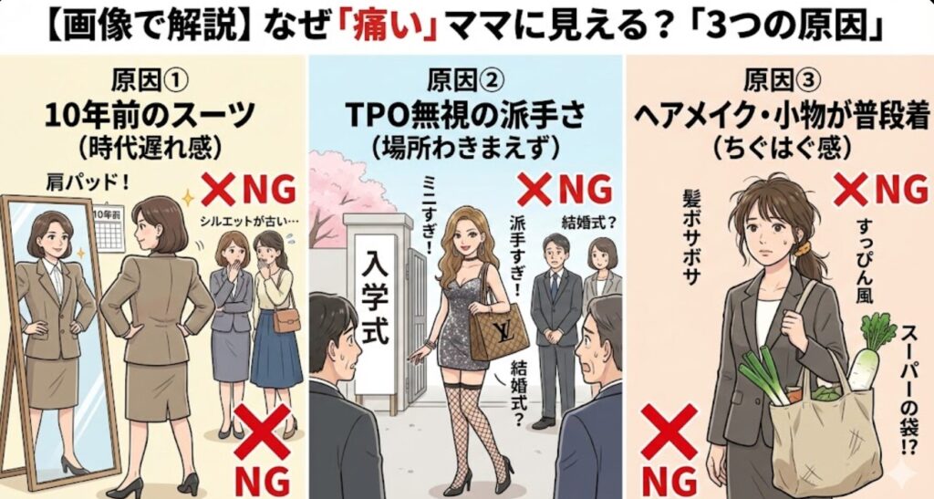 おしゃれにおいては、ついつい「自分が着たい服」を選びがちですが、たいせつなのは「周りがどう感じるか」という逆算思考です。「痛い」認定されてしまう原因は、大きく分けてこの3つです。