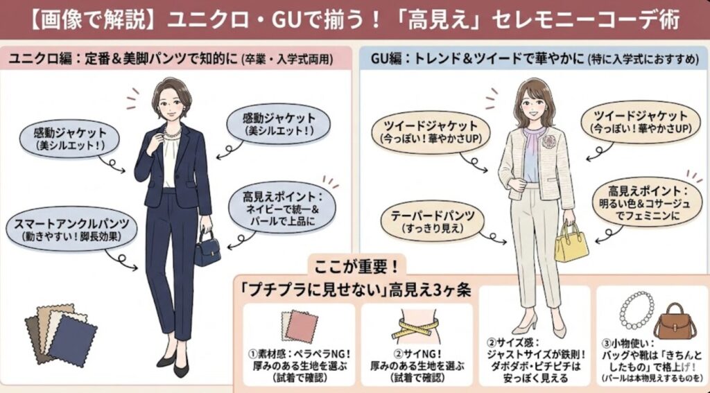 そこで今回は、そんな迷えるお母さんたちのために、マナーを守りつつ、程よくトレンドを取り入れた「素敵ママ」に見える正解コーデを徹底解説します。しかも! たった数回のために高いスーツを買わなくても大丈夫。ユニクロやGUを使った「高見え」テクニックも伝授しますよ♪
