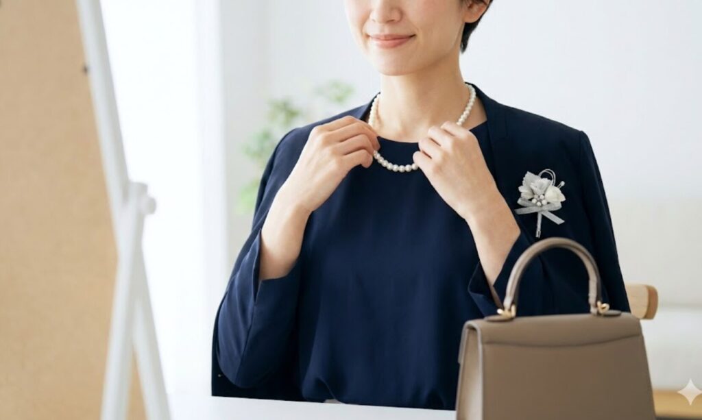 ユニクロなどのシンプルな服を選んだ場合、「ちょっと地味すぎるかな?」と心配になるかもしれません。そこで重要になるのが、アクセサリーやバッグなどの小物使いです。小物を変えるだけで、一気にセレモニー感が出ますよ。