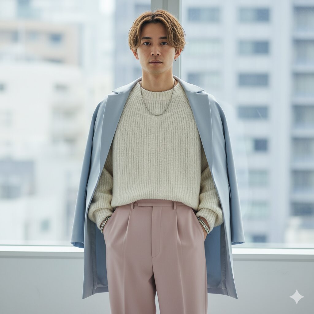- 色彩とシルエットの「対比」が鍵です。全身を柔らかなトーンでまとめるだけでなく、どこか一箇所に硬質な素材(例:革靴やハリのあるパンツ)を意図的に取り入れる「コントラスト」の技術を使えば、洗練されたモード感が生まれ、ただ優しいだけではない絶妙なバランスになります