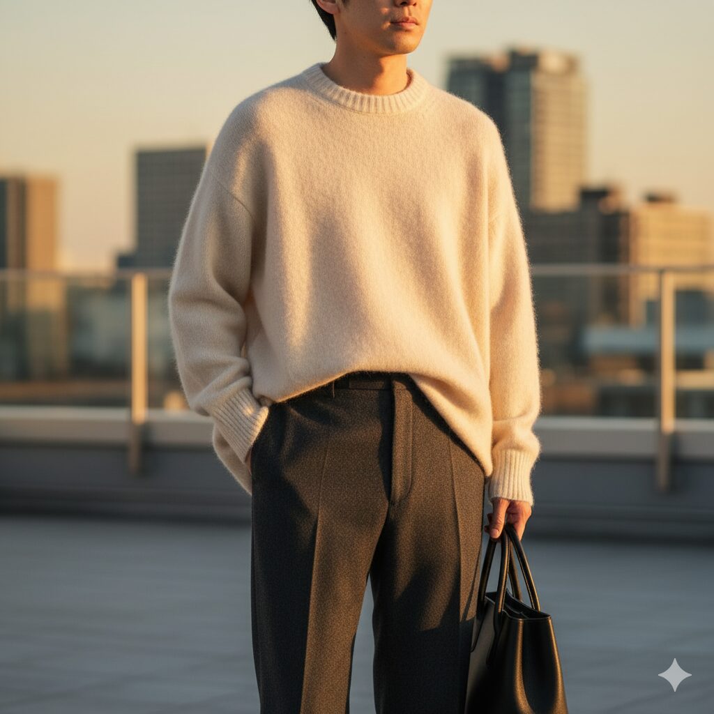 その柔らかいトップスに、あえて硬質な素材(ハリのあるウールパンツやパリッとしたチノパン)のボトムスを合わせることで、質感の対比が生まれ、コーディネートに奥行きと洗練度が付与されます。