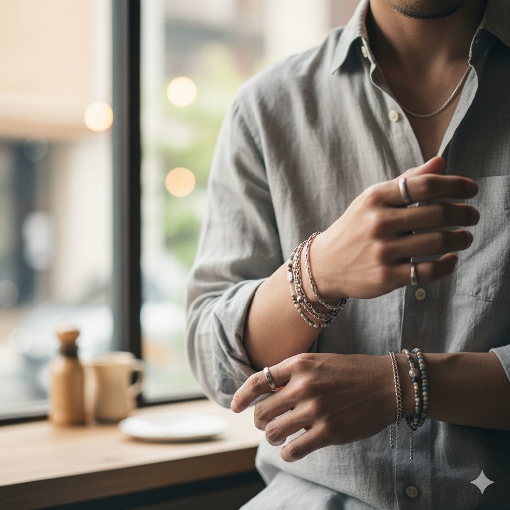 特にアクセサリーは、従来の「男性用」「女性用」という枠組みにとらわれず、細めのアンクレットやビーズブレスレットなどの軽やかでカラフルなアイテムを取り入れましょう 22。少ない投資で、シンプルな装いに中性的なアクセントを加えられますよ。
