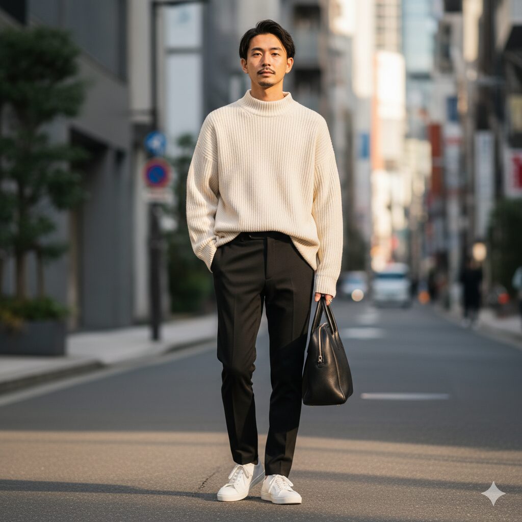 これは、従来の男性的な要素を意図的に緩和し、柔和で洗練された印象を与えるための論理的な着こなし技術です。このロジックさえマスターすれば、あなたはセンスに頼らず、自分の理想とする「柔和で洗練された自分」を再現性高く表現できますよ!