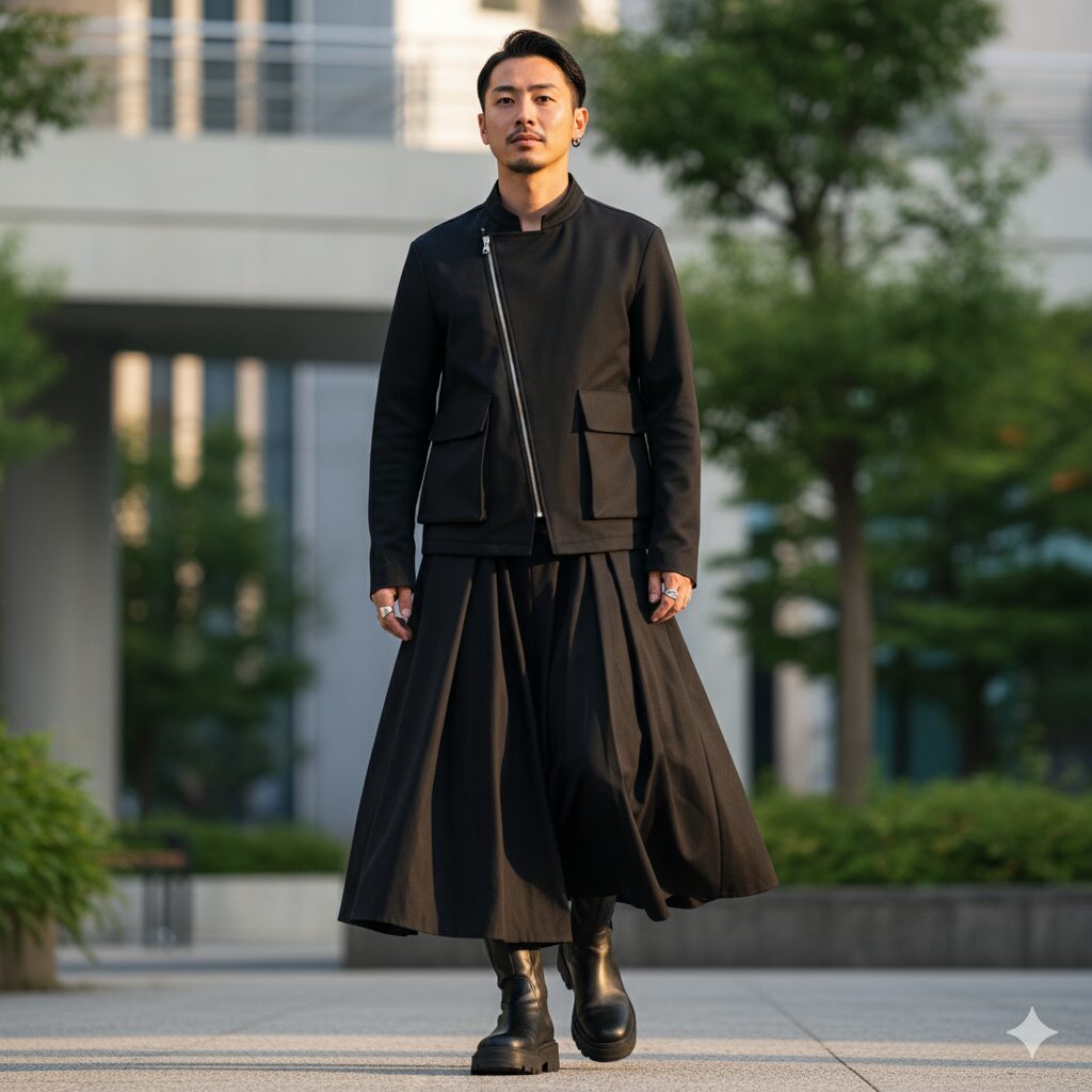 従来の男性向けボトムスの枠を超え、スカート風のパンツや、極端にワイドでゆったりとしたパンツなど、多様なシルエットにチャレンジします。 - アクセサリーの自由化: