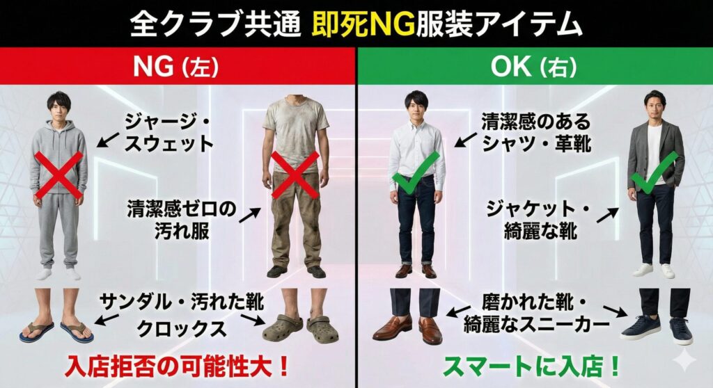 | クラブタイプ | 推奨される服装スタイル | 避けるべき主要アイテム | その他注意点 |