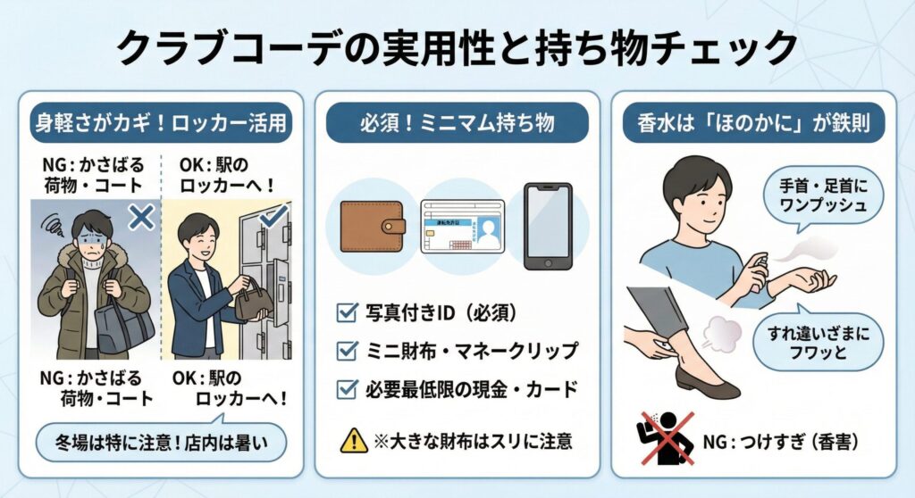もしどうしても荷物が多い場合は、入店前に最寄りのコインロッカーを利用しましょう。身軽に動けることで、クラブでの楽しさも倍増しますよ!