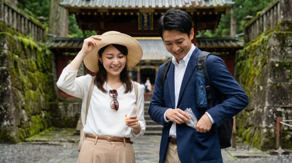 さて、服装と靴の準備はバッチリ!でも、日光旅行を本当に「スマート」に、そしてストレスなく楽しむためには、実は服装や靴以外にも知っておきたい大切なポイントがあるのです。ここからは、荷物を増やさずに快適さをアップさせる「賢い持ち物」と、旅先で「浮いたり、無知だと思われたりして恥ずかしい思いをしたくない」というあなたの本音に応える「マナー」について解説しますね。
