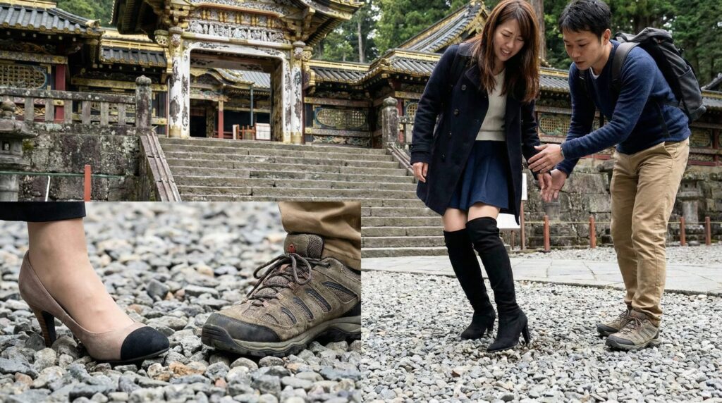 日光東照宮に行ったことがある人なら分かると思いますが、境内は「深い砂利道」と「不揃いな石段」のオンパレードです。ヒールのある靴で行くとどうなるか?