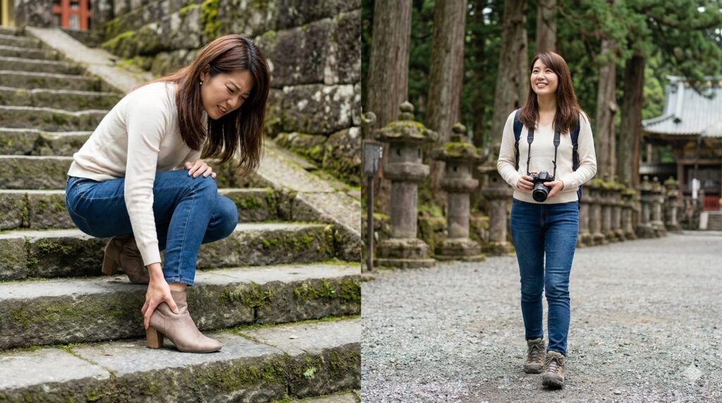 服装と同じくらい、いえ、それ以上に重要なのが「靴選び」です。はっきり言います。ここで失敗すると、日光旅行は「苦行」になります。