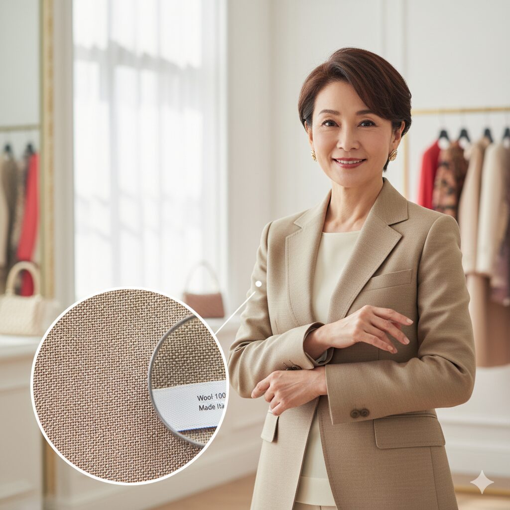 素敵なコーディネートを決めたら、最後に確認したいのが「素材」です。50代のヌン活服選びは、若い世代の「トレンド追従」型とは一線を画します 。私たちは、流行よりも品質、耐久性、そして「品格」を重視しますよね。