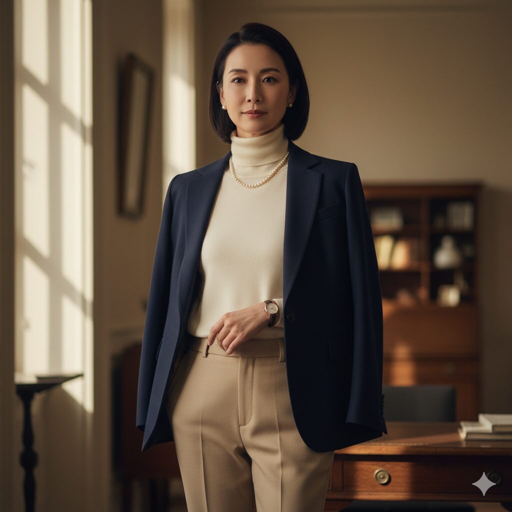 敢えて遊びを加えず、アイテムの「質の高さ」を前面に押し出すことで、その顔立ちの持つ「知的な信頼感」が最大化されます。オールドマネーの哲学を最もストレートに表現できるタイプと言えるでしょう。