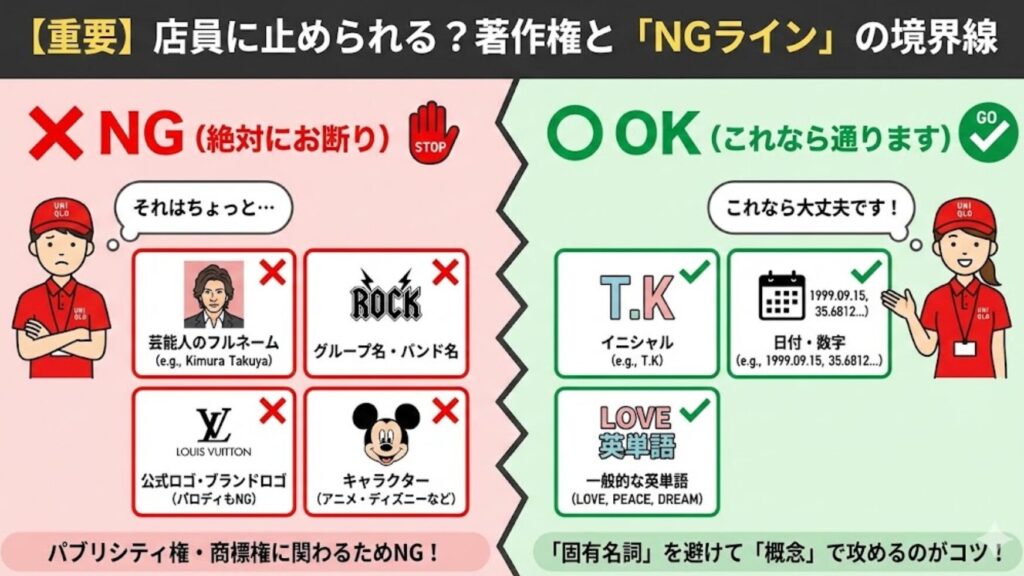 「えっ、名前もダメなの!?」と驚くかもしれませんが、有名人の名前には「パブリシティ権」という権利があるため、店員さんの判断でNGになることが多いです。
