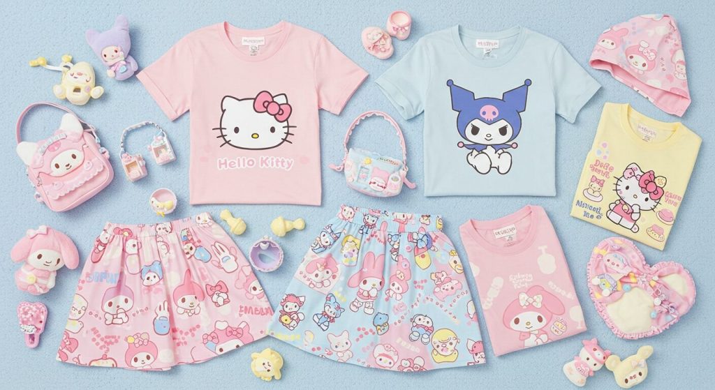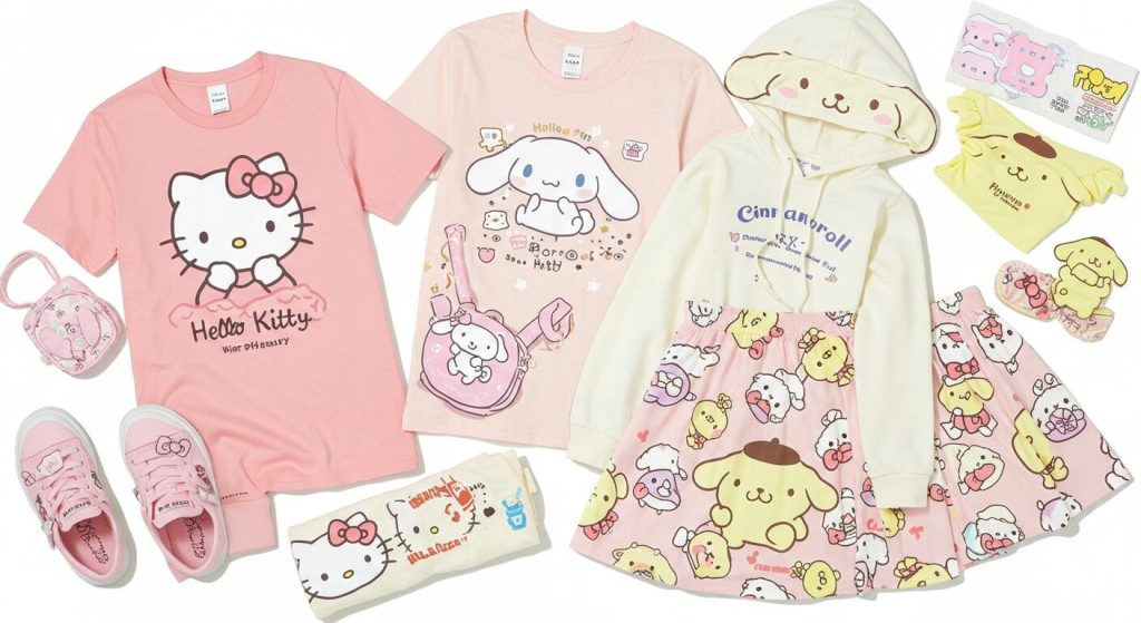 - キティちゃんなら赤やピンク、シナモロールなら水色や白、マイメロディならピンク、クロミちゃんなら黒や紫…みたいな感じで、全身を推しキャラカラーでまとめるんです!
