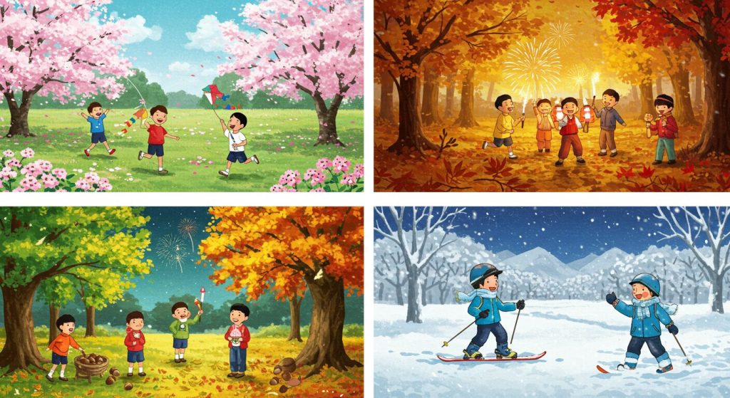 明るい色使い、動きやすさ、汚れにくさが鍵です。子どもらしい活発さを引き出す、ポップなカラーやデザインを取り入れましょう。でも、派手すぎず、清潔感を忘れずに! - 季節別コーデ例: