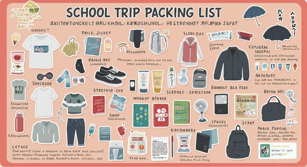 - 修学旅行先の気温の変化に対応できるように、重ね着できる服装がマスト!