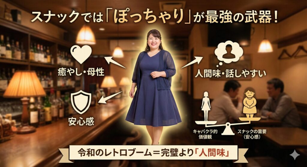 実は、スナックという場所において、「ぽっちゃり」は欠点ではなく、最強の才能(武器)です。