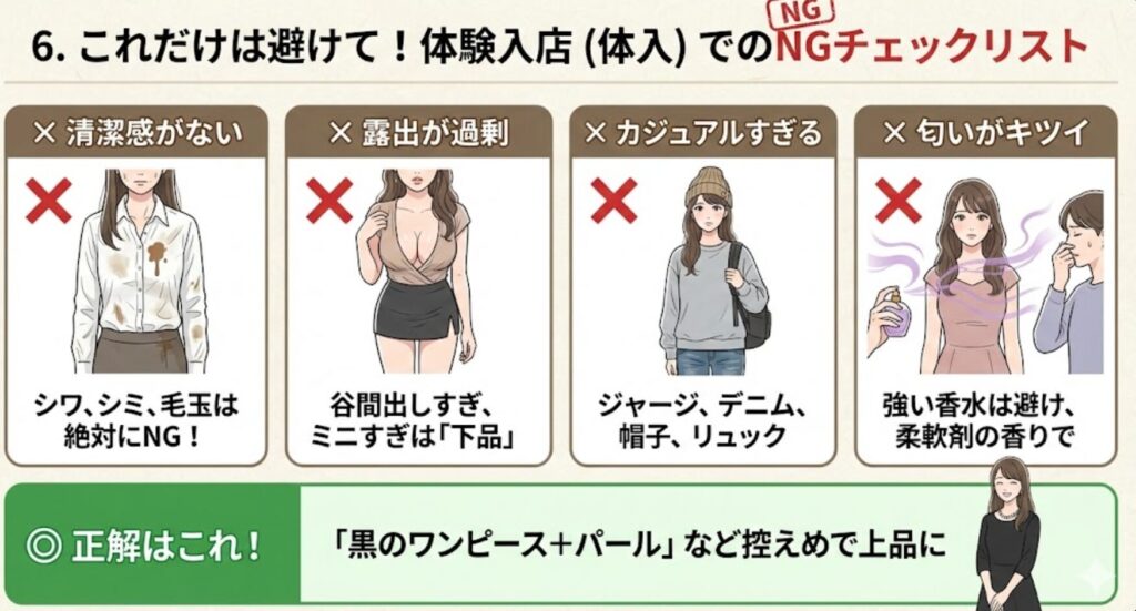 特に初めての体験入店では、気合を入れすぎて派手になるより、「黒のワンピース+パールのネックレス」のような、少し控えめでお見合いに行くような服装の方が、ママや他スタッフからの好感度が高いですよ。