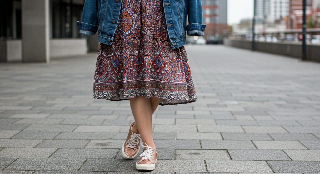 柄ワンピース × デニムジャケット × きれいめスニーカー