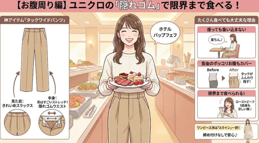 この「ユニクロ元取れコーデ」なら、苦しさを感じることなく、最後のデザートまで笑顔で完食できます。