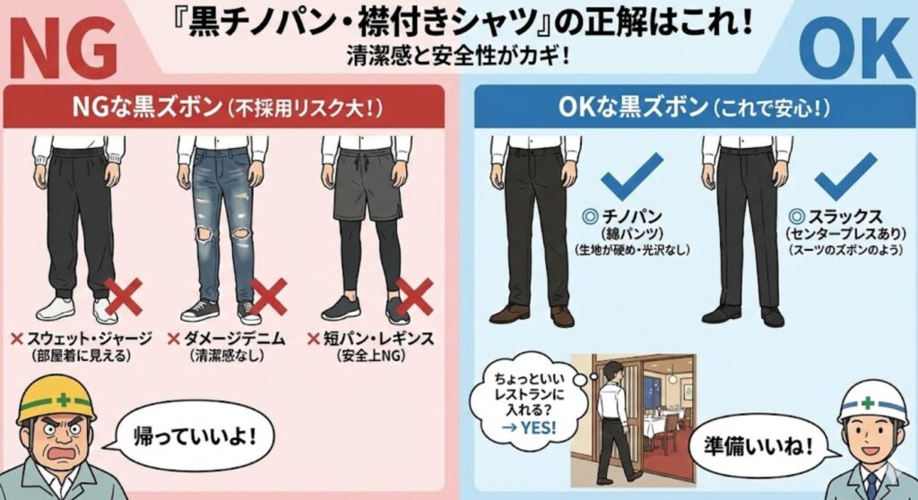 • 「黒のチノパン(ジーンズNG)」
