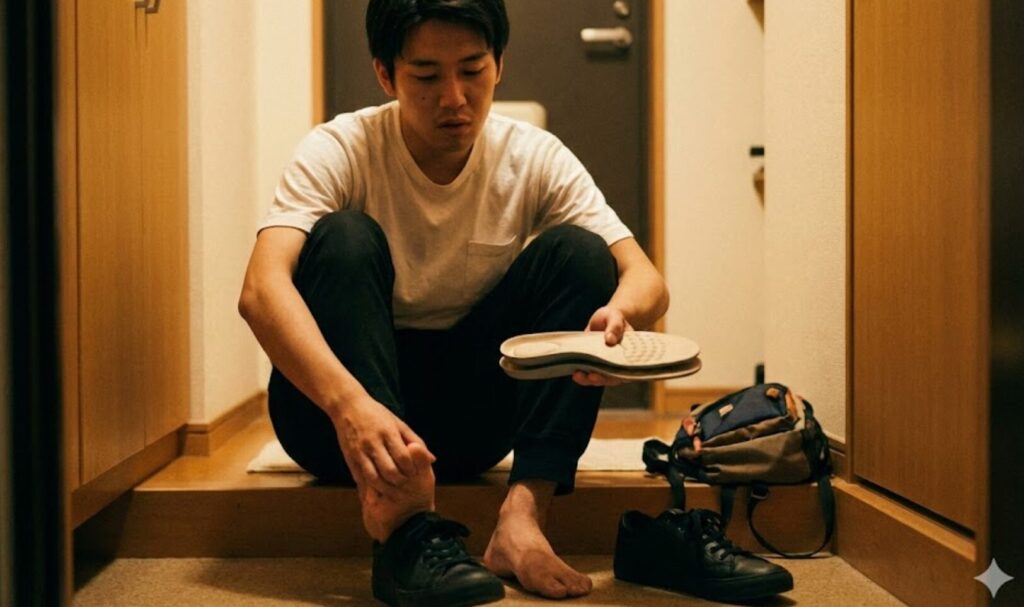 100均のものでも構いませんが、できればドラッグストアで売っている「衝撃吸収タイプ」を一枚敷くだけで、疲れが半分以下になります。これ、大げさじゃなく本当です! 仕事終わりの足のむくみが全然違うので、ぜひ試してみてください。
