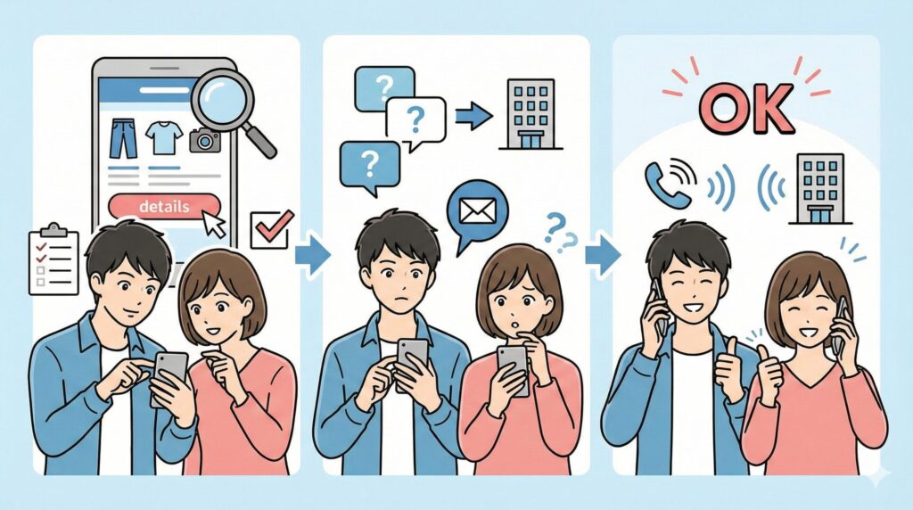 「当日になって『え?それNGなの?』って言われるのが一番困る…」わかります!ここでは、そんな事態を避けるために、事前に服装を確認する方法を、マニュアル形式で徹底解説します。「もう確認漏れなんてしない!」ってくらい、完璧にマスターしちゃいましょう♪