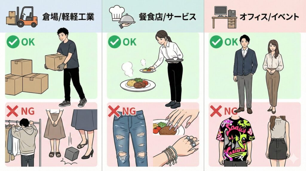 レストランとか、接客業の場合、お店の雰囲気に合わない服装だと、お客さんに悪い印象を与えちゃうかもしれません。 - 安全面: