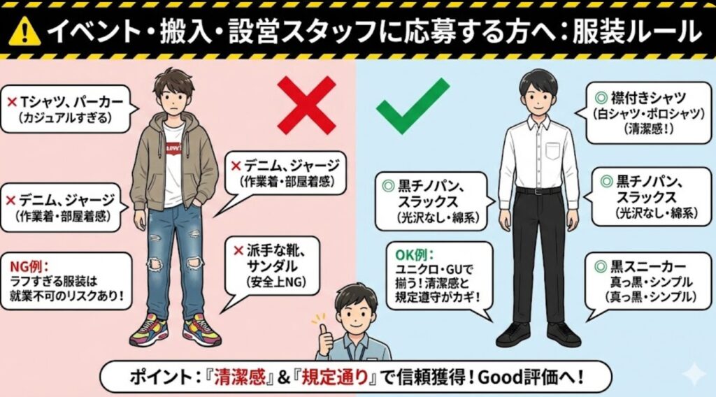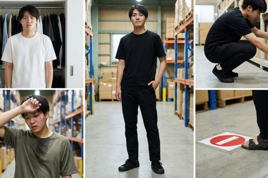 もし、あなたが応募した案件が「イベントスタッフ」や「搬入・設営」なら、倉庫作業とは全く違うルールがあるので注意が必要です。 「黒のチノパン」「襟付きシャツ」という指定を、ユニクロとGUで安く完璧に揃える方法を別記事でまとめました。 現場で怒られたくない方は、必ずチェックしてください▼