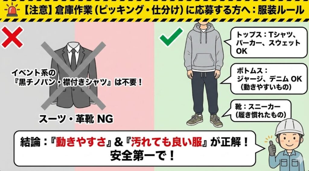 特に募集が多い「倉庫作業」については、安全靴や軍手の選び方など、より詳しいルールを別記事にまとめました。