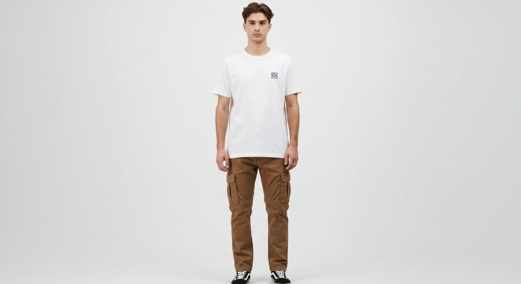 OK例: チノパン、カーゴパンツ、Tシャツ(無地orワンポイント)など。