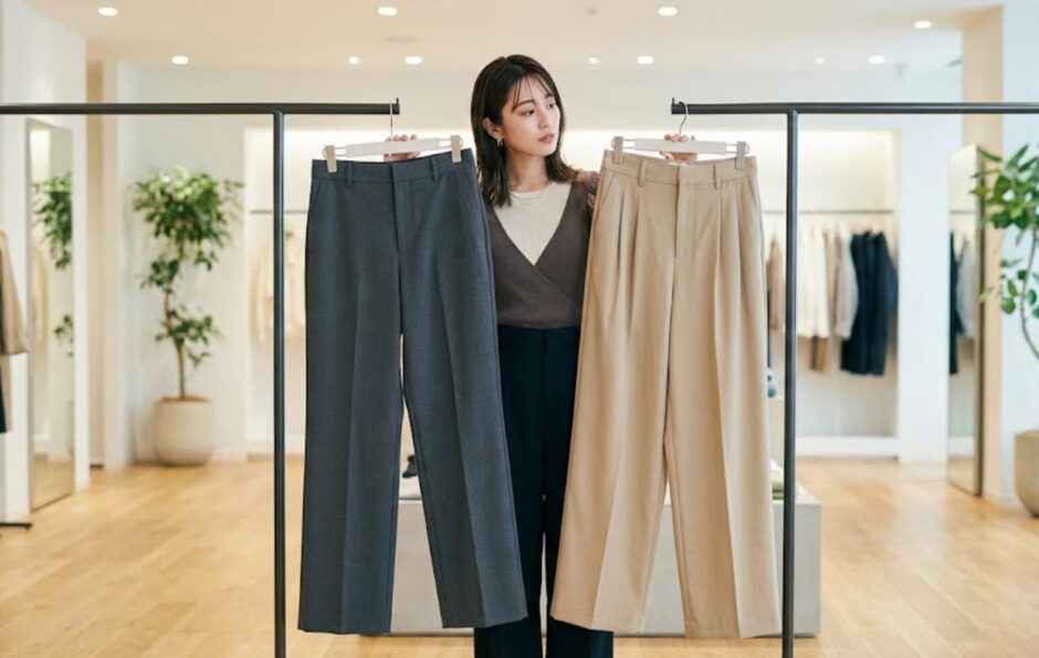 ユニクロの「ワンタック」と「肉厚生地」が、肉感を拾わずに真っ直ぐな脚線美を作ってくれます。GUのツータックは、腰回りに厚みを足してしまうので避けたほうが無難。