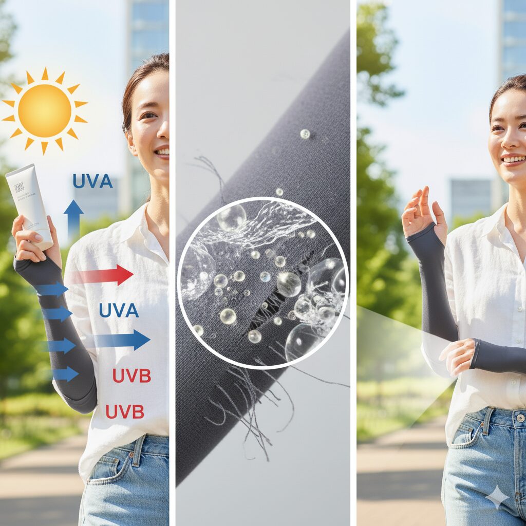 • 問題はUVAです。こちらはより深部に浸透しやすく、アームカバーの防御をすり抜けたわずかな量でも、夏を通して蓄積されると無視できないダメージになります 。