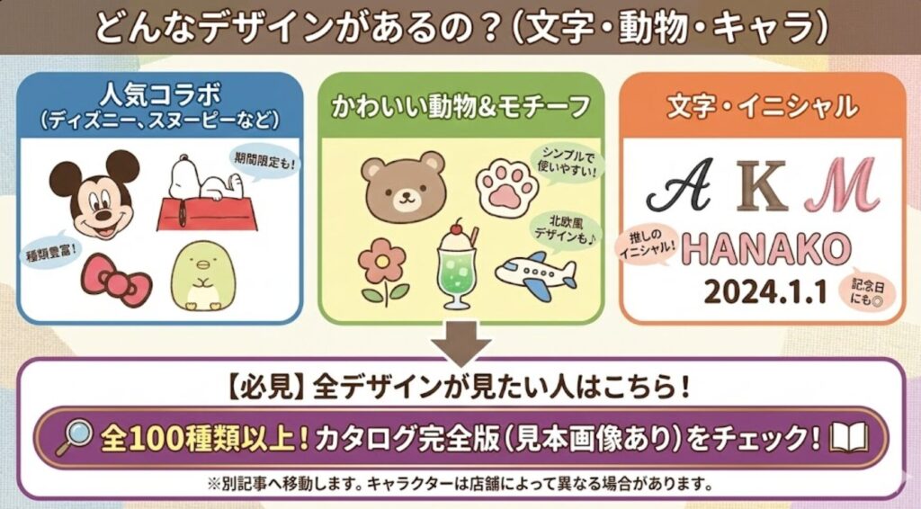 実は、店舗によって選べるキャラクターが違ったり、期間限定のデザインがあったりするんです。そこで、全デザインのラインナップや、実際に刺繍した見本画像を、別の記事でガッツリまとめました!