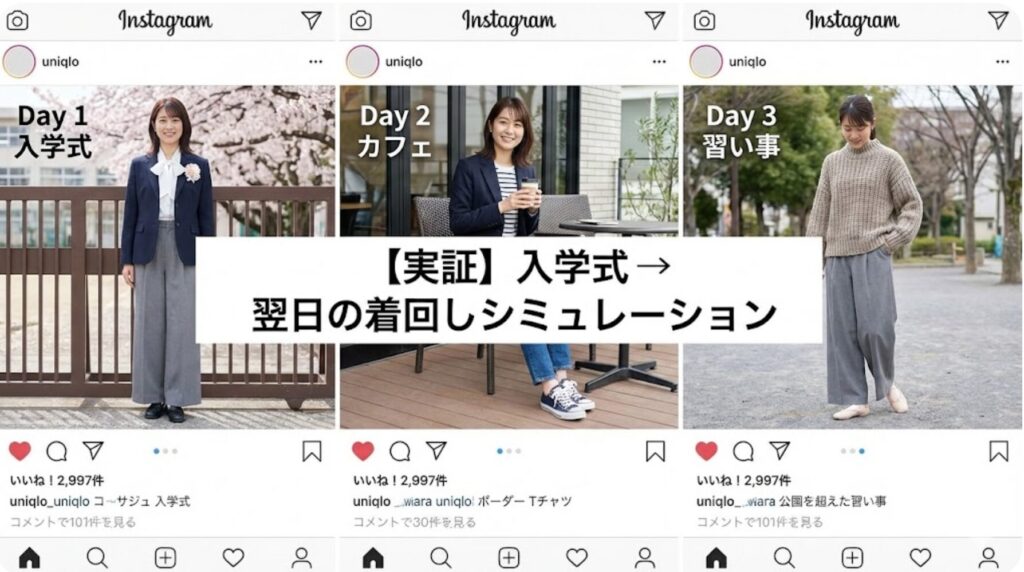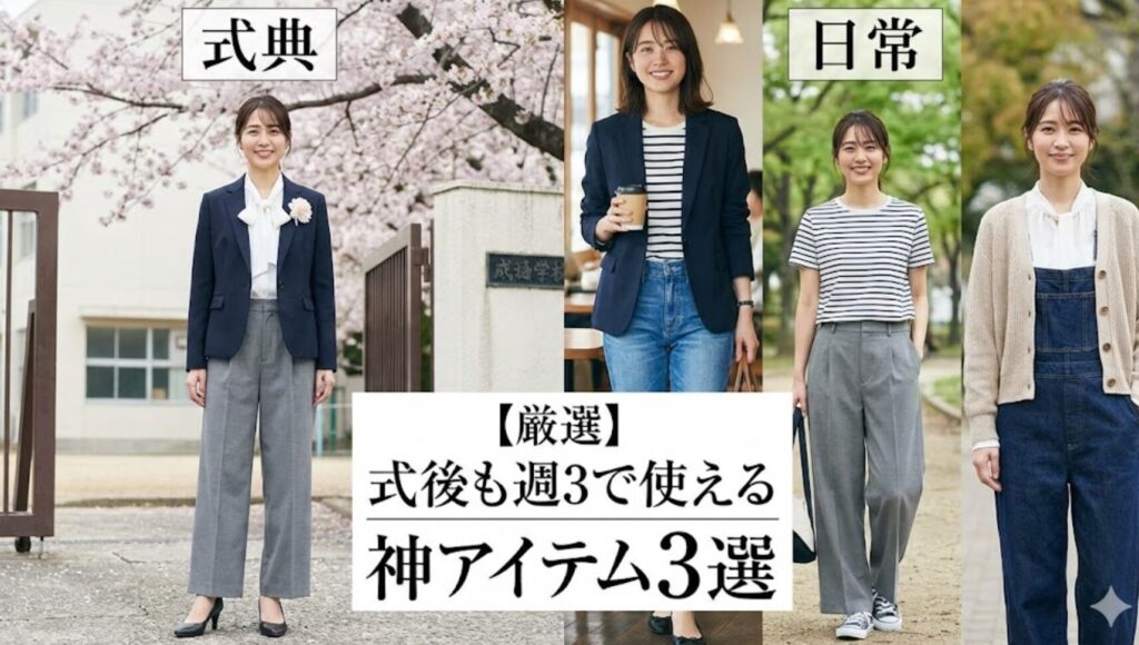 | Day 1 (入学式) | ジャケット(紺) + ブラウス + ワイドパンツ(灰) + パンプス | 「知的で洗練されたママ」 コサージュをつければ完璧な式典仕様。誰が見てもユニクロだとは気づきません。 |