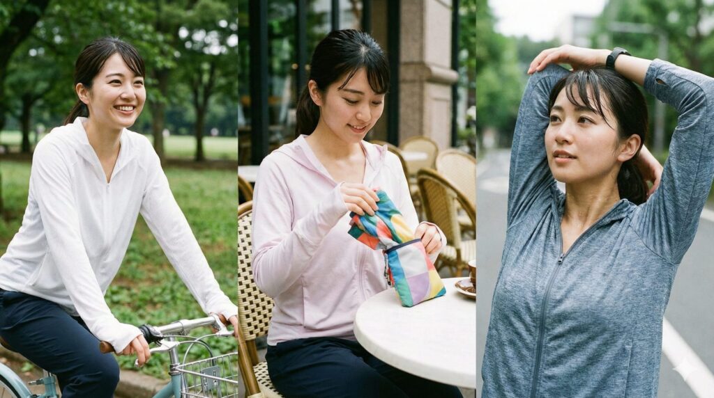 | 主な用途 | 通勤、お散歩、ママの公園着 | 旅行、冷房対策、バッグの常備 | ランニング、ジム、ガチ運動 |