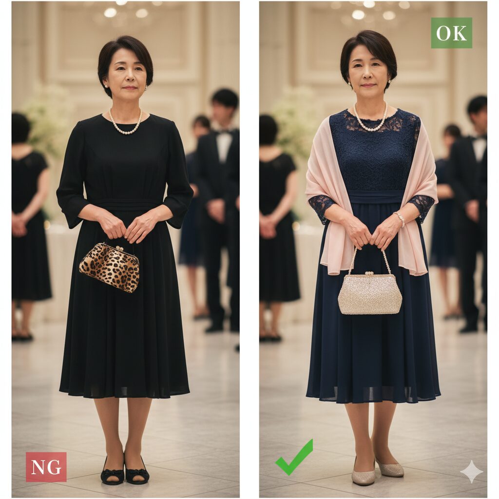 地味に見えるのを避けたいなら、全身を黒や濃紺だけでまとめず、パールやゴールドのアクセサリー、または明るい色味のボレロで、顔周りに華やかさの「光」を集めるようにしてください。