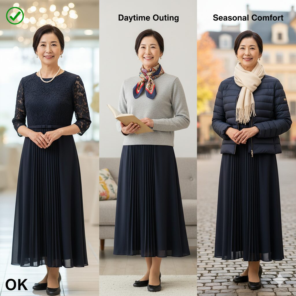 70代ユーザーの「無駄な出費を抑える」という要求に応えるため、フォーマルウェアを結婚式後も活用する「着回しレシピ」は必須です。