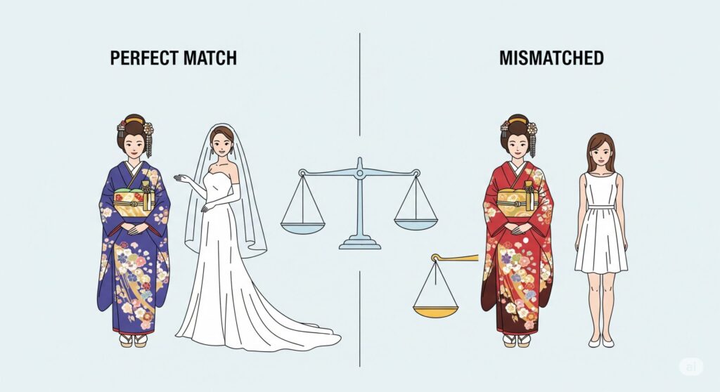結婚式の服装で悩んでいませんか?「結婚式で両家の服装が和装と洋装でバラバラになってしまう」と不安なあなたへ、この記事が心のモヤモヤを解消するお手伝いをします。