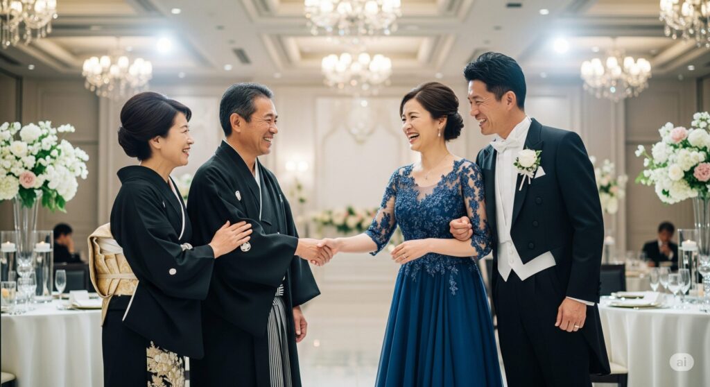 この表は、両家の服装が和装・洋装で異なっていても、「同じ格」に属する服装を選べば調和がとれることを示しています。たとえば、新郎側の母親が「黒留袖」(正礼装)を着るなら、新婦側の母親は「アフタヌーンドレス」(正礼装)を選ぶ、というように活用できます。