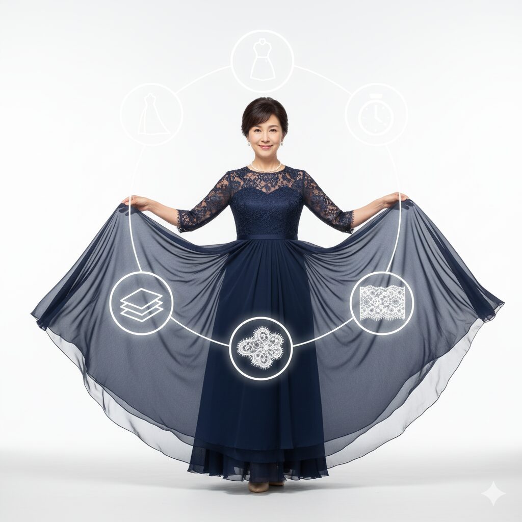 • これは、体型全体をカバーするためだけでなく、足元の露出を抑え、親族としての高い品格を担保するためのマナー対策でもあります。