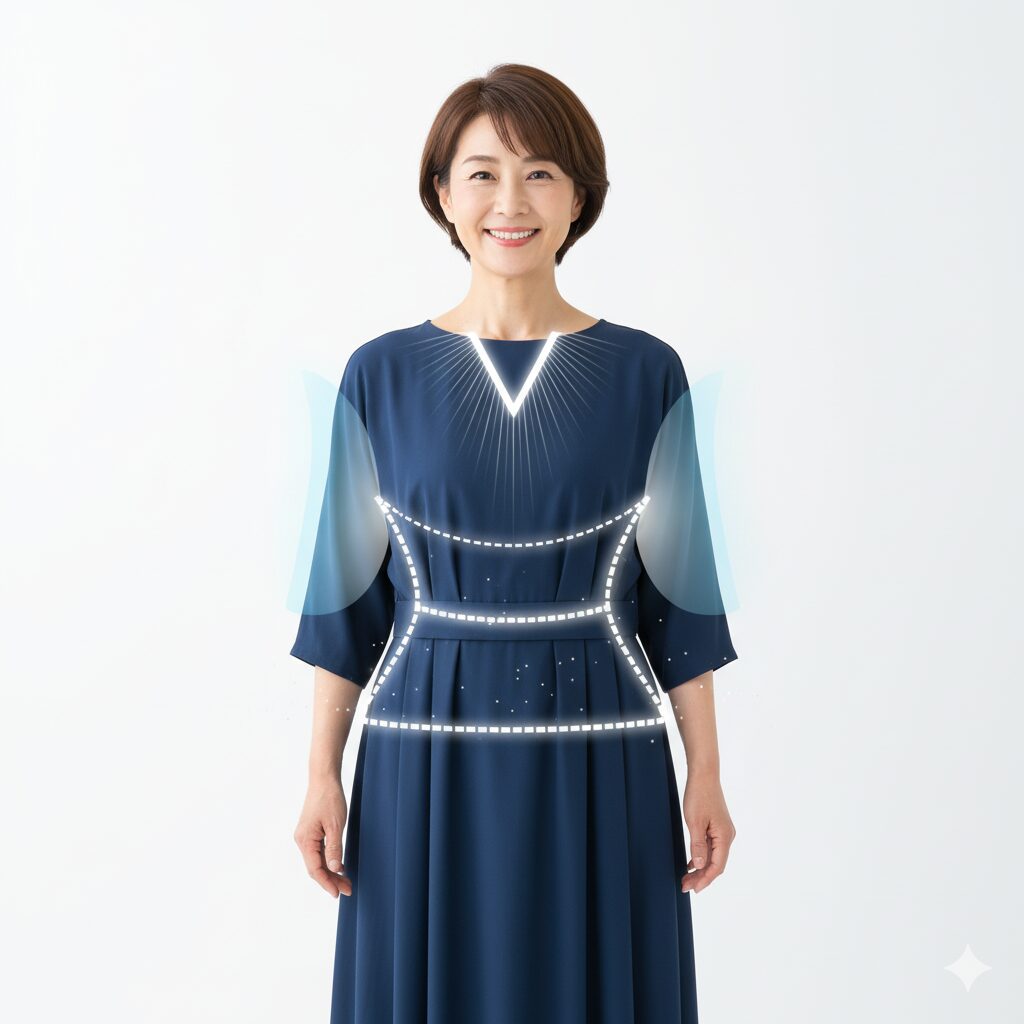 60代のぽっちゃり体型の方が特に懸念されるのは、二の腕、肩周り、そして腹部の3箇所に集中しています。この3つの部位をカバーするための具体的な解決策と、その視覚的原理を解説しますね。