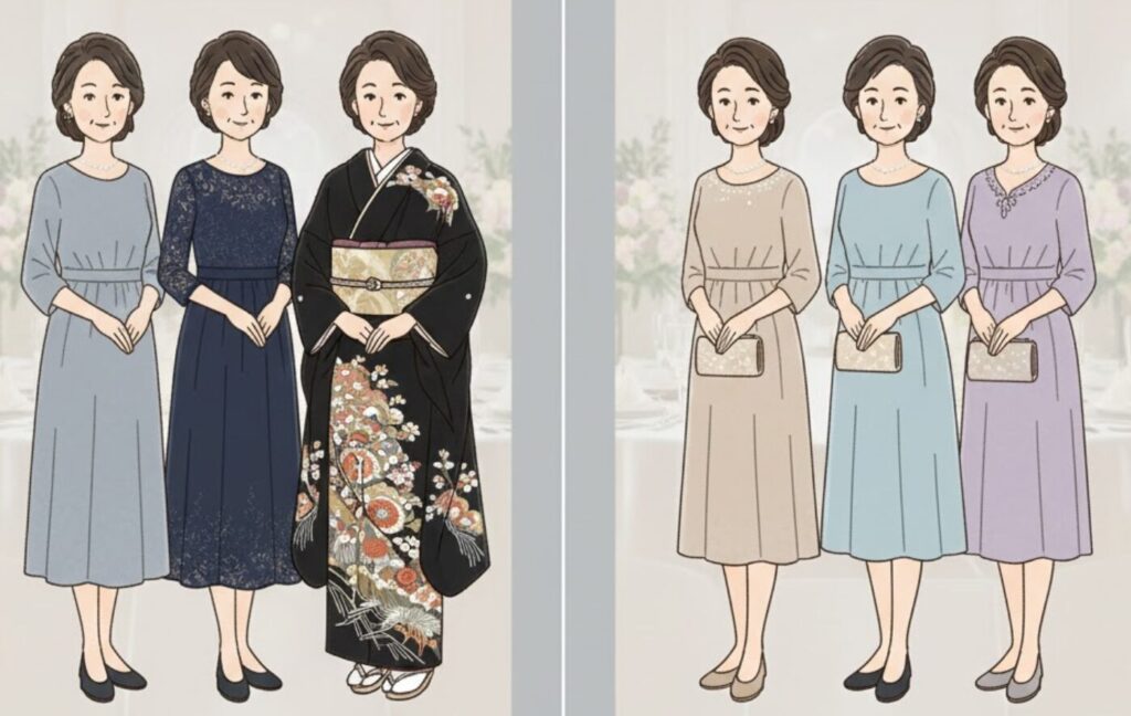 新郎新婦の母・親族最高の品格とマナー遵守が最優先。主役(新郎新婦)より目立たないように細心の注意を払うこと。派手さを避け、落ち着いたトーンが基本。ネイビー、黒、ダークグリーン、ボルドーなど。
