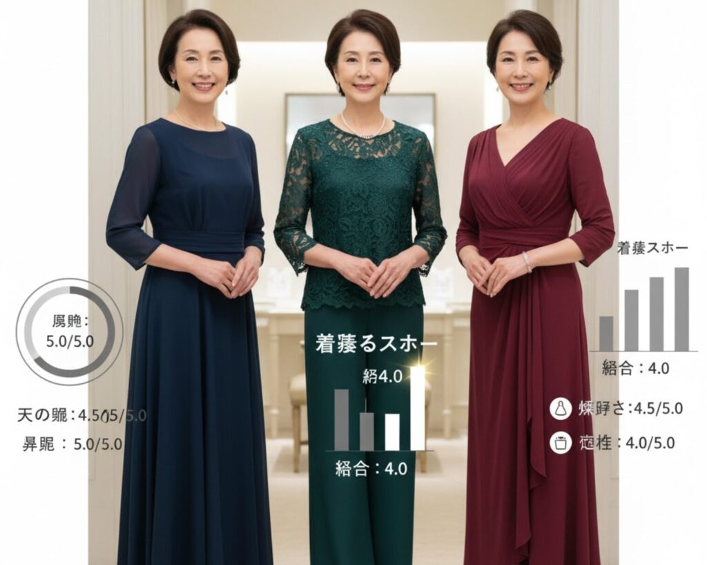 私たちは、標準的な60代ぽっちゃり体型(例:身長155cm、体重70kg )での着用シミュレーションに基づき、提案するドレスやセットアップのデザイン要素がもたらす「視覚的な細見え効果」を「専門家評価による着痩せスコア(5点満点)」として明記します 。